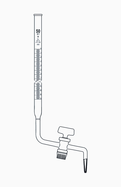 Biureta klasy B, wykonana z wysokiej jakości białego szkła borokrzemowego, zgodnie z normą ISO 385 (oprócz 10 ml z podziałką 0,1). Posiada kran szklany boczny, który charakteryzuje się szczelnością i możliwością dozowania cieczy po kropli. Klasa B oznacza normalną precyzję odmierzania cieczy podczas miareczkowania