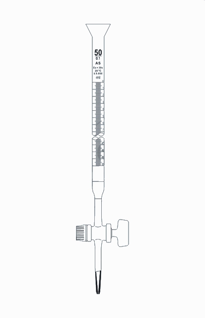 Biureta klasy AS, wykonana z wysokiej jakości białego szkła borokrzemowego, zgodnie z normą ISO 385 (oprócz 10 ml z podziałką 0,1), odpornego na działanie gorącej wody, kwasów, a także roztworów zasadowych. Posiada kran szklany prosty, który charakteryzuje się szczelnością i możliwością dozowania cieczy po kropli. Pasek Schellbacha pomaga precyzyjnie odczytywać poziom cieczy w biurecie. Różni się od zwykłych biuret wlewem w kształcie stożka.