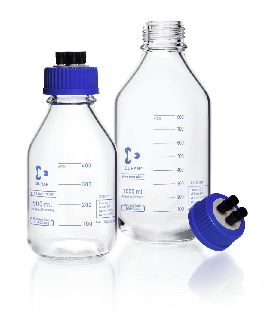 Butelka DURAN® HPLC poj. 500 ml, GL 45, w komplecie z 4-portową nakrętką PP i uszczelkami, odporna na ciśnienie (fi86mm/h 176mm) |