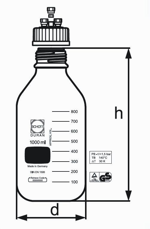 Butelka DURAN® HPLC poj. 1.000 ml, GL 45, w komplecie z 4-portową nakrętką PP i uszczelkami, odporna na ciśnienie (fi101mm/h225mm) |