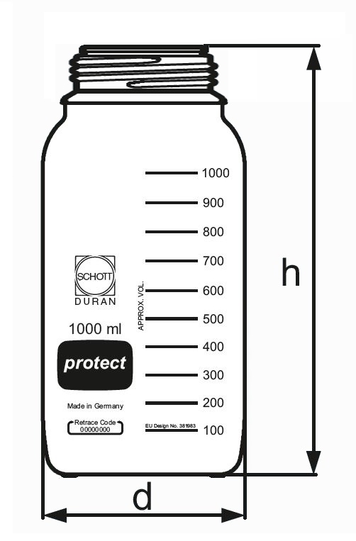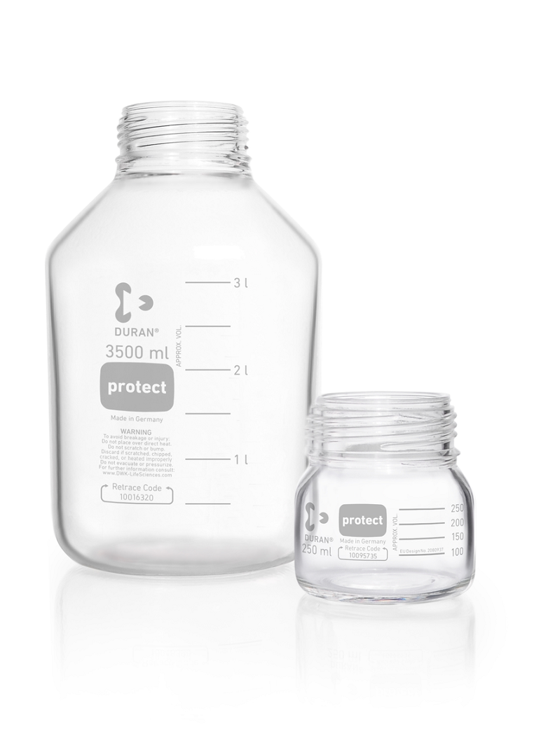 Butelki DURAN® PROTECT+ GLS 80, bezbarwne powlekane poliamidem, z osłoną przeciwpyłową, bez nakrętki i pierścienia wylewowego - DWK